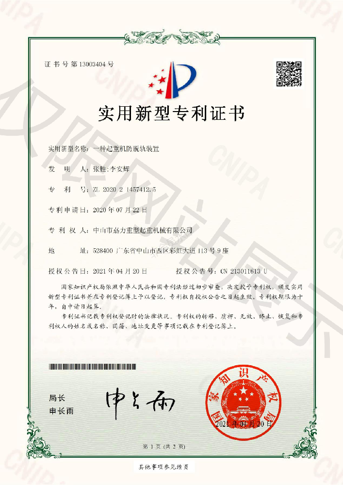 實用新型專利證書 -- 起重機防脫軌裝置