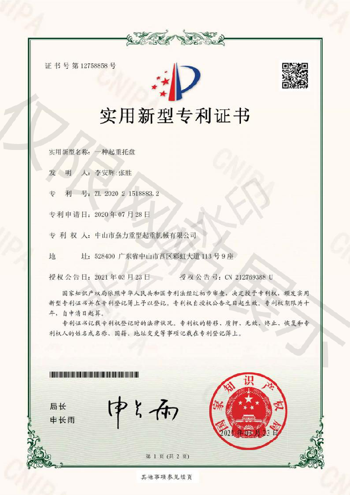 實用新型專利證書 -- 起重托盤