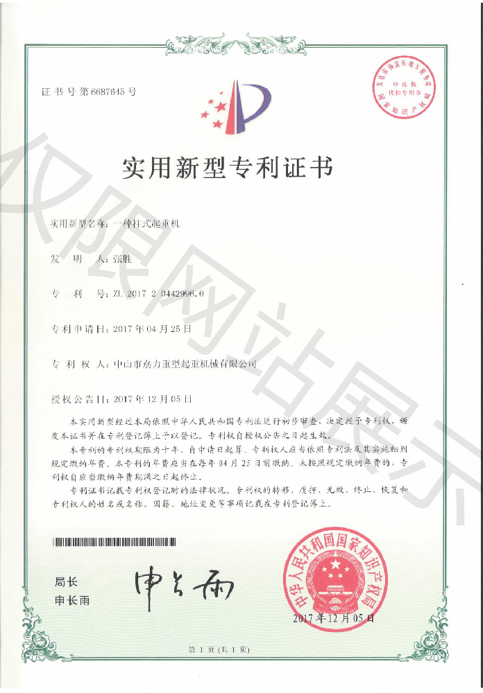 實用新型專利證書 -- 柱式起重機
